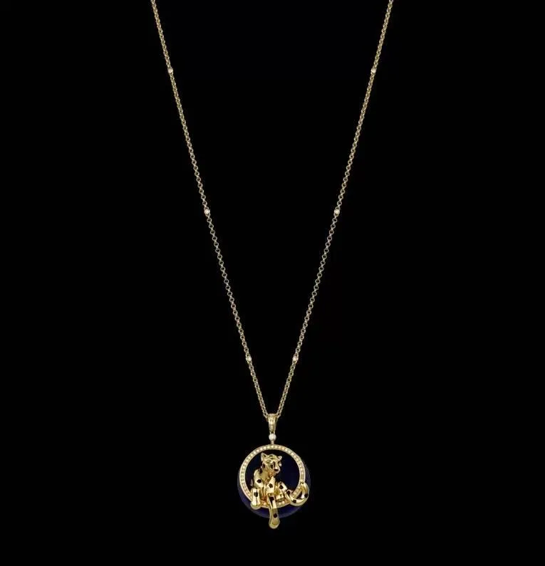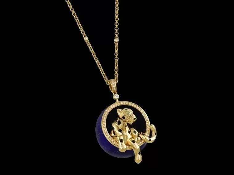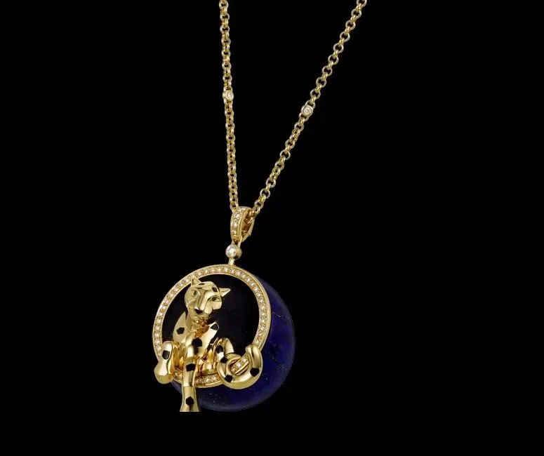 Là dây chuyền vàng 18K, mặt dây chuyền có một vòng tròn được khảm đá quý bên ngoài, bên trong có một con báo đốm ngồi lên, mũi báo là hạt mã não, mắt báo là đá ngọc hồng lựu, bên trên còn khảm kim cương.