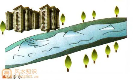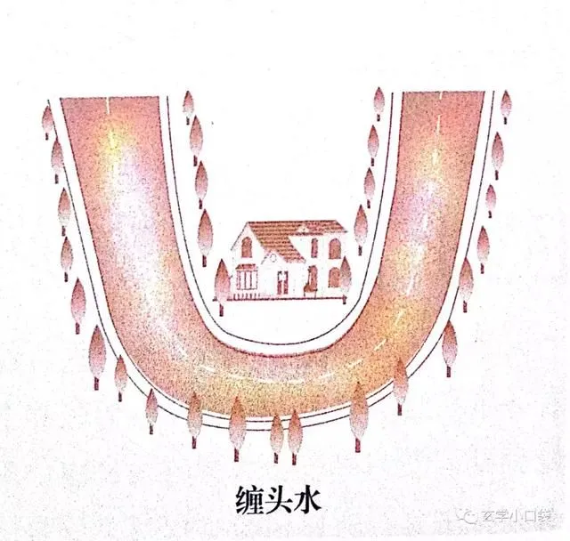 *Triền Đầu Thủy - 缠头水: Loại bố cục này được thầy phong thủy xưa xem là biểu thị cho tài lộc cuồn cuộn. Triền Đầu Thủy ý là bao bọc phần đầu lại. Nếu có một con đường hình chữ U bao quanh một ngôi nhà, thì đây cũng được gọi là Triền Đầu Thủy. Độ cong của dòng nước (con sông) hoặc con đường Triền Đầu Thủy nhất định phải đủ sâu, vậy thì mới đúng như lời của thầy phong thủy xưa là tài lộc phong phú cuồn cuộn tiến vào không ngừng, tụ tài lại không lọt tài. Còn nếu độ cong chữ U của Triền Đầu Thủy không mượt mà, hơn nữa tạo thành góc nhọn hoặc là sừng nhọn, thì ngược lại chính là bố cục không tốt.