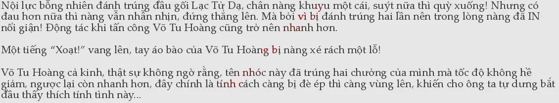 Nhưng Võ Tu Hoàng lại rất kinh ngạc, hiển nhiên là trong lúc giao chiến, ông ta đã vô tình giúp Lạc Tử Dạ giải phóng nguồn nội lực đã ngủ yên trong cơ thể y. Nhưng vấn đề nằm ở chỗ, nếu y muốn mở được nội lực ra thì đầu tiên là phải dốc hết can đảm, dám đón nhận một chương kia của mình. Trước khi nội lực trong cơ thể được mở ra, trên người tên nhóc Lạc Tử Dạ đó không hề có một chút nội lực nào, vậy mày lại dám tiếp?