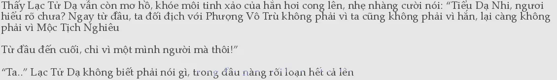 Chẳng lẽ nàng thật sự có ưu điểm kinh thiên động địa, khiến cho quỷ thần khiếp sợ mà nàng không biết nhưng hai người họ lại phát hiện ra sao, cho nên họ mới cùng coi trọng nàng? Ngay lúc nàng còn đang mơ hồ, đột nhiên ngón tay thon dài của hắn lướt qua mặt nàng