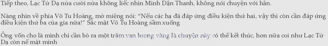 Vì để tránh cho Lạc Tử Dạ nói tiếp, nói ra những từ khiến cho mình càng không thể nhịn được, ông tức1thì đen mặt, mở miệng nói: “Lạc Tử Dạ! Đủ rồi! Trẫm đáp ứng ngươi là được.” Đây vốn là chuyện của lớp trẻ, với tư cách trưởng bối như ông, nghiêm túc mà nói thì ông không nên nhúng tay vào bênh vực, làm mất phong độ của những người bề trên