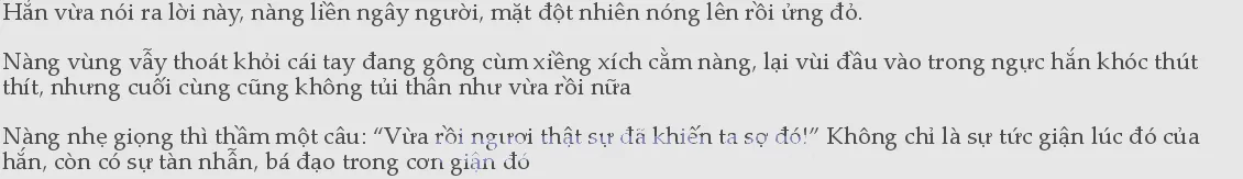 “Không thở được.” Trong quá trình ấy, nàng phát ra những tiếng không rõ ràng lắm rồi đấm hắn một cái, hắn mới buông nàng ra