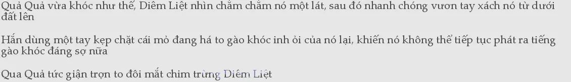 Động vật có lông kia ngẩng đầu lên, đó chính là Quả Quả! Sau khi nhảy lên, nó liền vươn một cánh ra, chỉ vào Diêm Liệt, cất giọng the thé nói: “Diễm Liệt, liên quan gì đến ngươi, ngươi làm gì thế? Quả gia đã tra được Lạc Tử Dạ, mùi của Lạc Tử Dạ ở bên...” Chữ “trong” còn chưa nói xong.