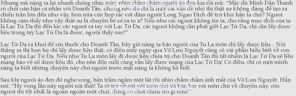 Dưới ánh trăng, cửa sổ gian phòng của Võ Lưu Nguyệt hơi mở ra. Một luồng ánh trăng chiếu rọi lên gương mặt xinh đẹp của nàng ta cùng với quần áo phong phanh trên người, đàn ông nhìn thấy cảnh tượng này rất dễ xuất hiện ý nghĩ đáng khinh. Người áo đen kia nói xong câu đó liền đột ngột tiến lên một bước, vươn tay thò vào vạt áo của Võ Lưu Nguyệt! Võ Lưu Nguyệt kinh hoảng, giơ tay định tát vào mặt hắn một cái.