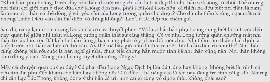 Lời1này nghe có vẻ chân thành tha thiết nhưng Lạc Tử Dạ thừa biết là chẳng có câu nào thật lòng, chẳng qua là Hoàng đế dùng chiêu bài tình thân nhằm mượn sức nàng giúp ông ta đối phó với Phượng Vô Trù mà thôi. Nàng cũng không để trong lòng, chỉ thuận miệng nói: “Nhi thần đã hiểu ý của phụ hoàng! Trên thực tế đúng là Phượng Vô Trù hơi quá đáng thật! Vậy phụ hoàng định làm thế nào?”