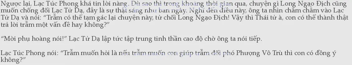 “Vậy Thái tử có biết trẫm thân là đế vương nhưng chỉ vì Phượng Vô Trù mà bị người ngoại quốc và người cố đô nhìn bằng ánh mắt như thế nào không?” Lạc Túc Phong nói đến đây thì thở dài một hơi rồi mới nói tiếp: “Thái tử, con là con trai của trẫm, cũng là người kế vị mà trẫm coi trọng nhất, cho nên hôm nay trẫm mới nói với con những lời này. Con phải hiểu cho nỗi khó xử và nỗi khổ tâm khi bắt buộc phải diệt trừ Phượng Vô Trù của trẫm!”