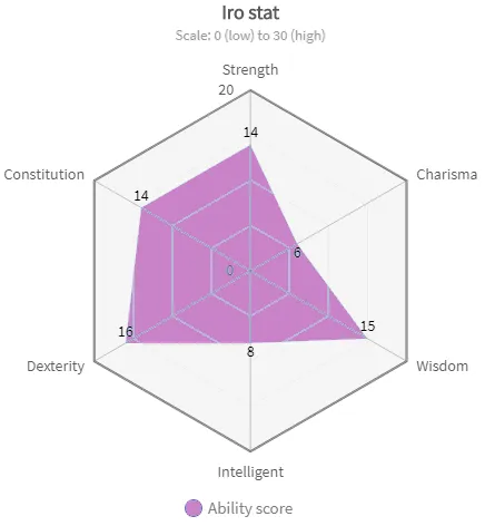 Tôi để Sabata tự lái trong khi dùng điện thoại coi sơ vài thứ. Dựa theo biểu đồ thông số của Iro thì tôi lấy làm ngạc nhiên là uy tín (charisma) và trí tuệ (intelligent) của cô ấy thấp phết. Trái lại, các thông số còn lại đều ăn đứt tôi, thậm chí tới sự khôn ngoan (wisdom) là thứ cao nhất tôi có chỉ ngang cô nàng Barbarian này.