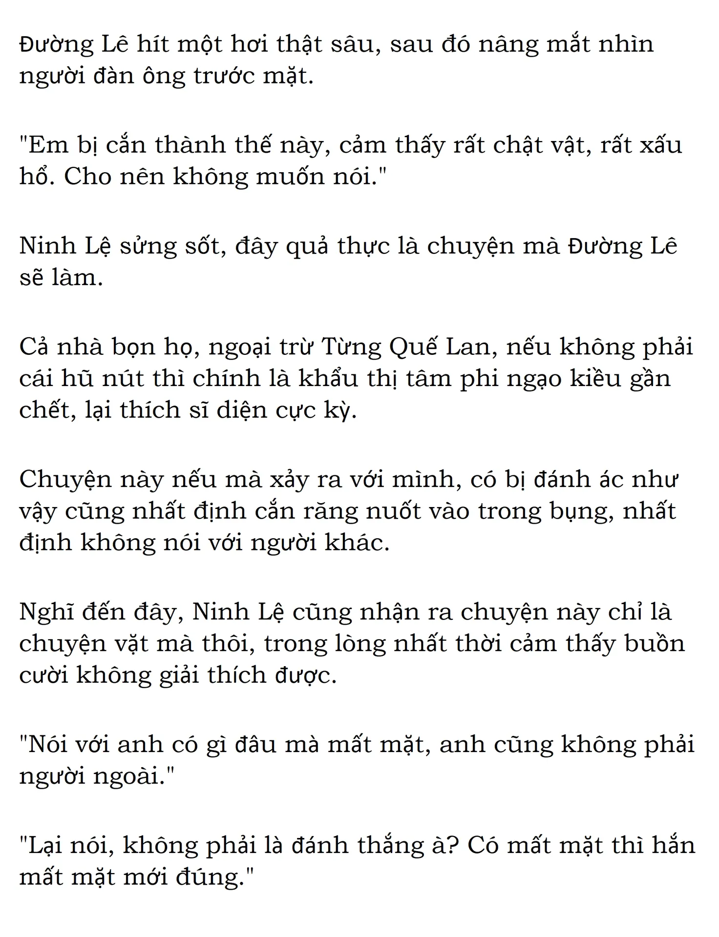 Cả nhà Đường Lê tính tình đều không tốt đẹp gì, đừng thấy bây giờ Ninh Lệ bề ngoài thành thục ổn trọng mà ham hố, nghe Từng Quế Lan nói hồi còn đi học, so với cô thì anh cũng không khiến người bớt lo được bao nhiêu.