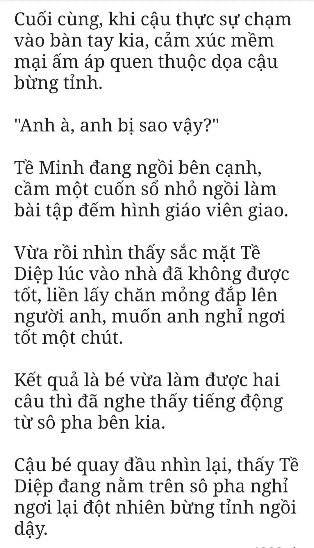Cậu hời hợt trả lời một câu, khi Tề Minh còn muốn hỏi thêm điều gì thì cậu mở miệng trước đánh gãy suy nghĩ của bé.