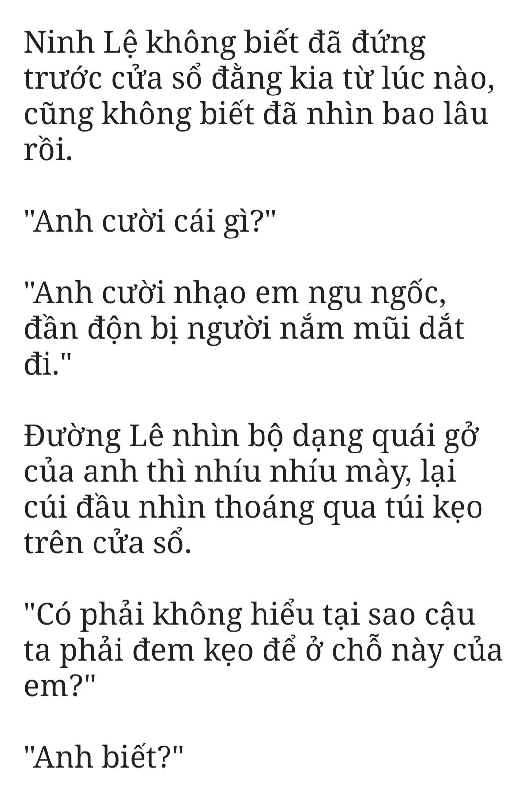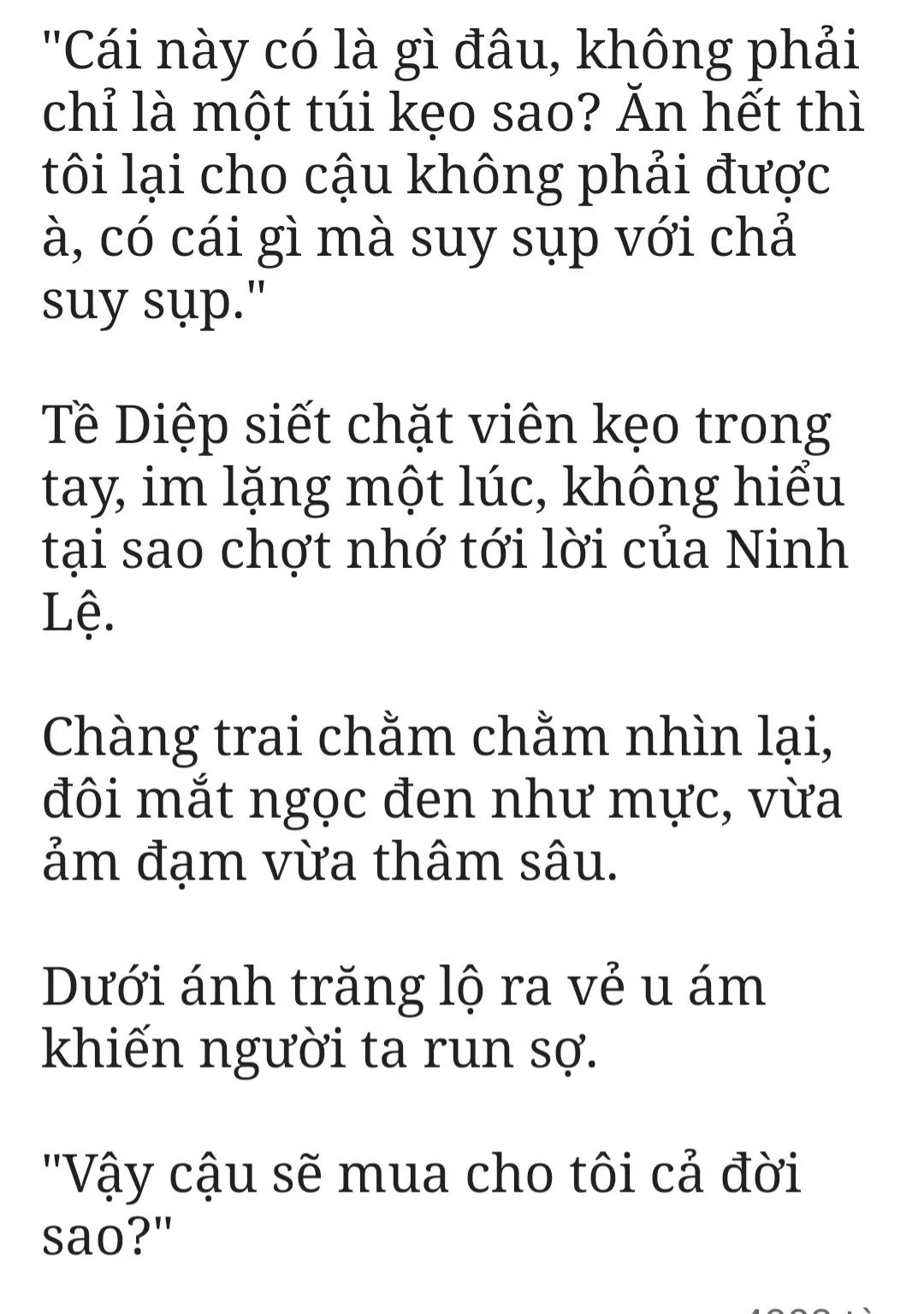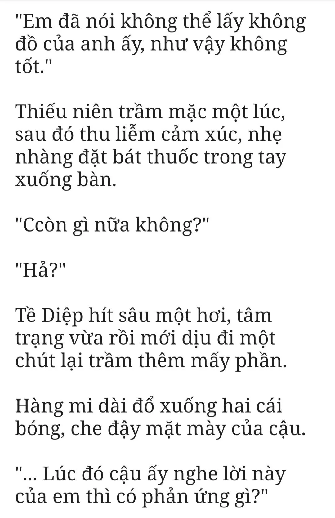 “Thực ra cũng không có gì. Em chỉ là nghĩ đến thuốc Đông y này đắng như vậy. Có hơi hối hận sáng nay không có lấy túi kẹo sữa dâu anh Đường Lê lén lút đưa cho.”