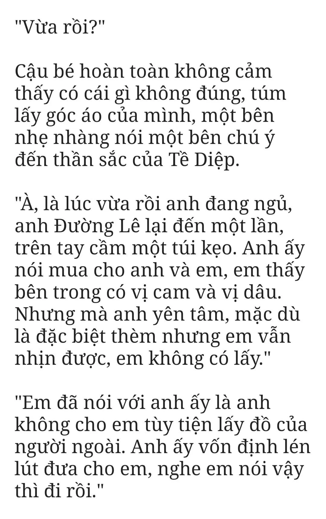 “Anh ơi, anh đừng hiểu lầm, em có nghe lời anh, em không có lấy kẹo của Anh Đường Lê. Hôm nay anh ấy lén lút đưa cho em em đã từ chối rõ ràng. Em thực sự một viên cũng không muốn. Thật đấy!”