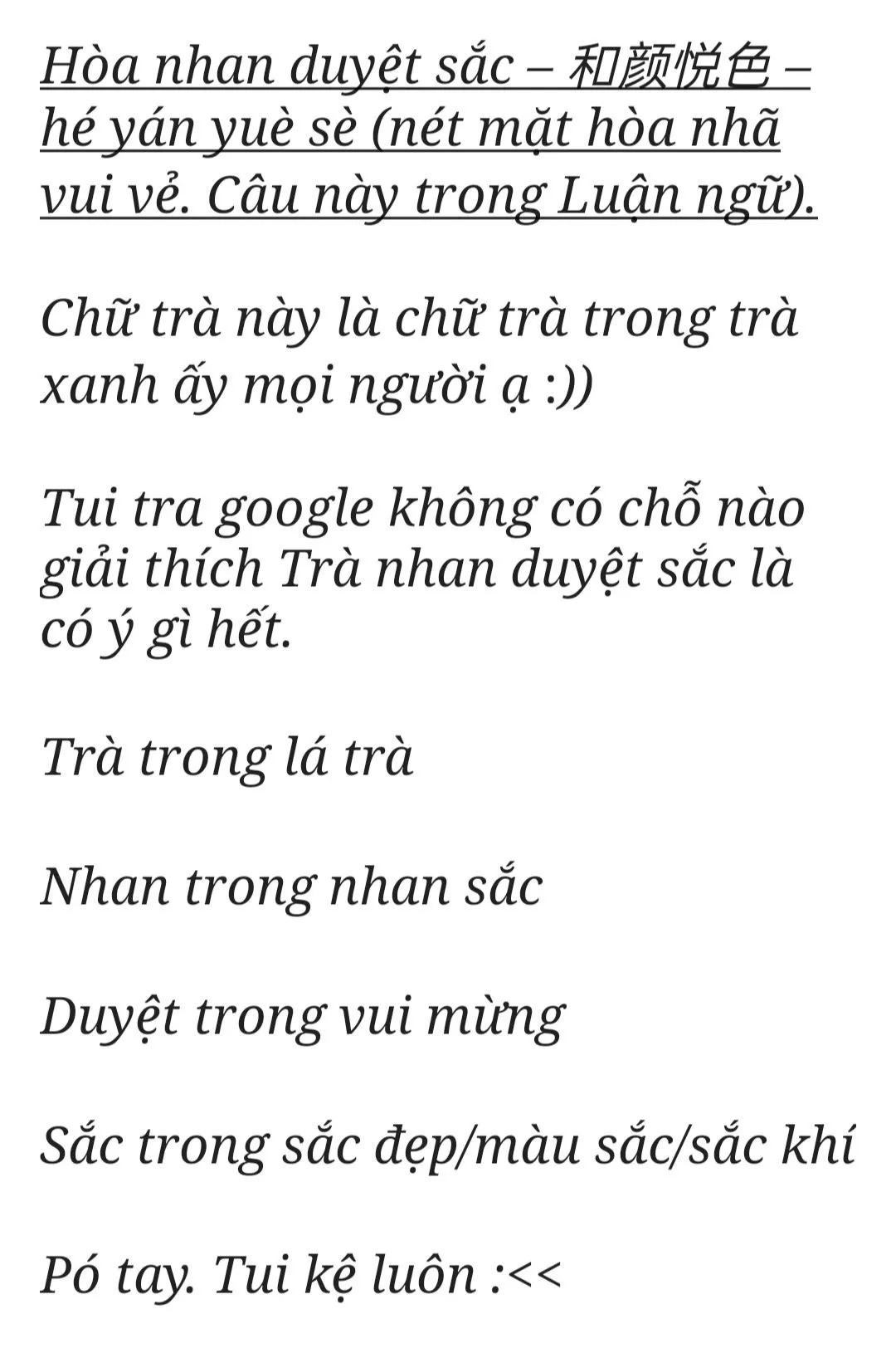 “Thực ra cũng không có gì. Em chỉ là nghĩ đến thuốc Đông y này đắng như vậy. Có hơi hối hận sáng nay không có lấy túi kẹo sữa dâu anh Đường Lê lén lút đưa cho.”
