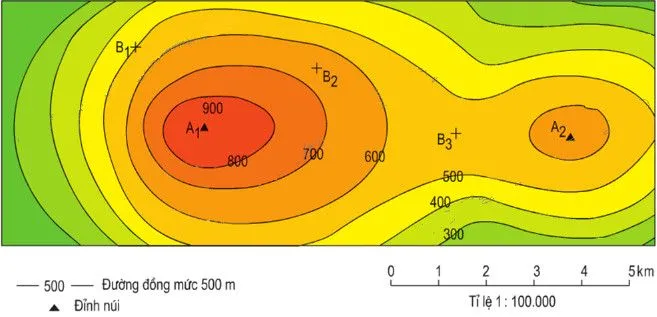 (2) Đường đồng mức: hay còn được gọi là đường bình độ, gồm các đường tròn lượn sóng được sử dụng trên bản đồ địa hình hai chiều để mô tả độ cao trên mặt đất.