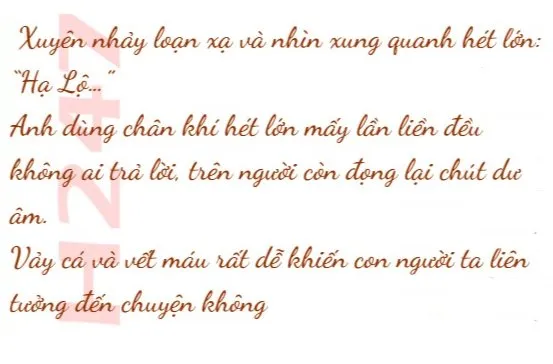 Trong hiện thực của anh nhìn thấy hàng chục vảy cá và một vũng máu.