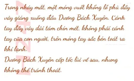 Đột nhiên Đinh Thiền liên tục vung quyền vào Dương Bách Xuyên khiến thế tấn công của Dương Bách Xuyên dừng lại giây lát. Nhân cơ hội này, hắn ta chỉ một ngón tay vào giữa trán, tay kia làm một thủ ấn kỳ lạ, đồng thời hô to: "Huyết mạch bảo vệ, mở phong ấn. Ma Viên Chi Thủ, chết đi cho tao!"