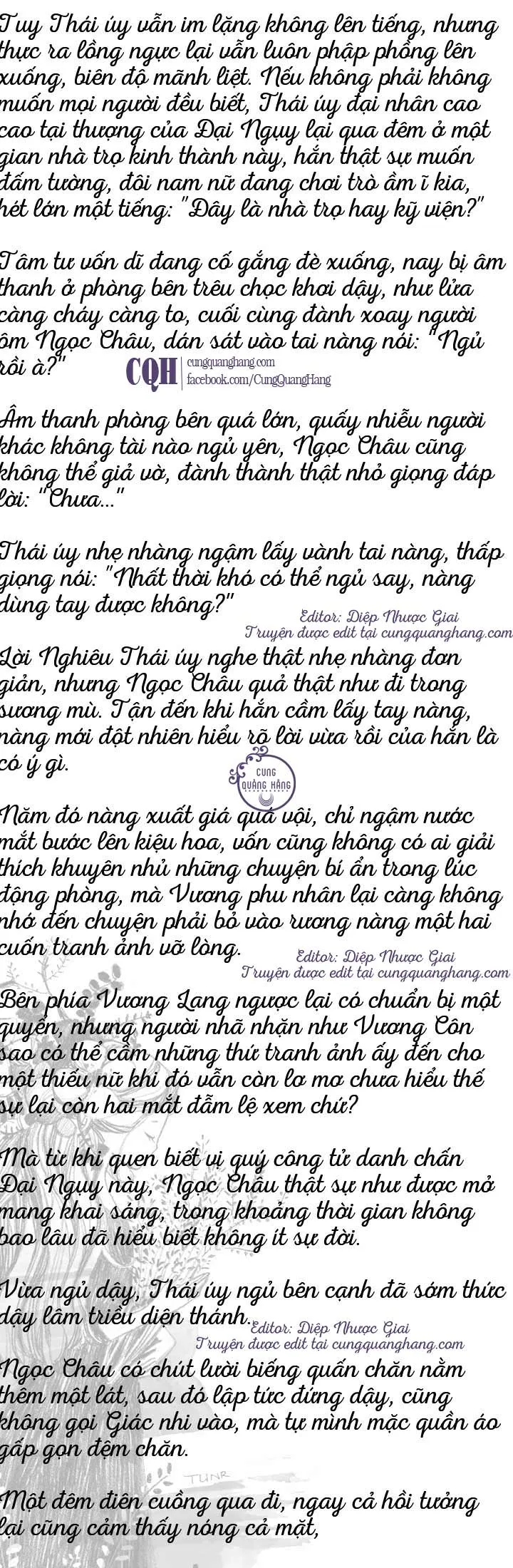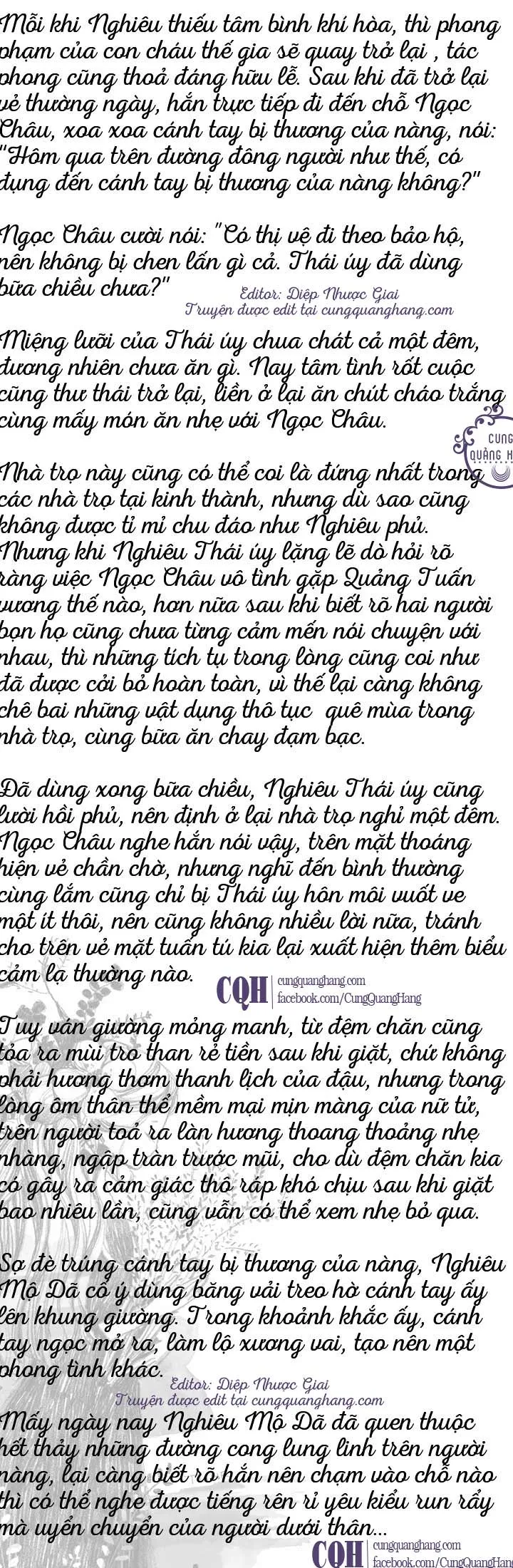 Ngọc Châu hơi cắn môi, mặc cho Thái úy xoa nắn, nhưng khi tay hắn luồn xuống dưới, nàng vội vàng lên tiếng: “Thái úy, Ngọc Châu vừa mới nhớ ra, Ngọc Châu đã đến nguyệt sự... Sợ là đến đêm lỡ mãnh liệt quá sẽ làm bẩn đệm chăn... Hay là ngài trở về phủ trước đi..."
