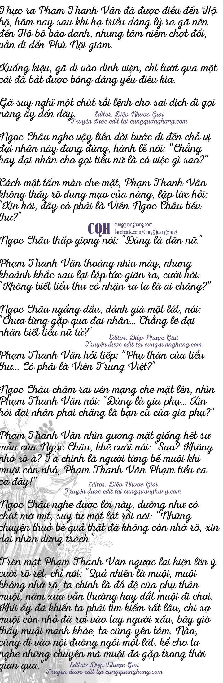 Nghe nói năm đó Ngọc Châu được Tiêu gia nhận nuôi, lông mày Phạm Thanh Vân lại nhíu lại lần nữa, ngay sau đó nghe nói nàng đã lập gia đình rồi lại bị nhà chồng bỏ, thì gã trầm mặc một hồi, nói: “Người của nhà họ Tiêu, ta cũng từng tiếp xúc một ít, đều là hạng thương nhân khắc nghiệt. Nếu năm đó người Tiêu gia không lén ôm muội đi, muội lớn lên bên cạnh ta, thì nào có phải vô duyên vô cớ chịu khổ như thế... Nhưng sao muội lại tới Phủ Nội giám?”