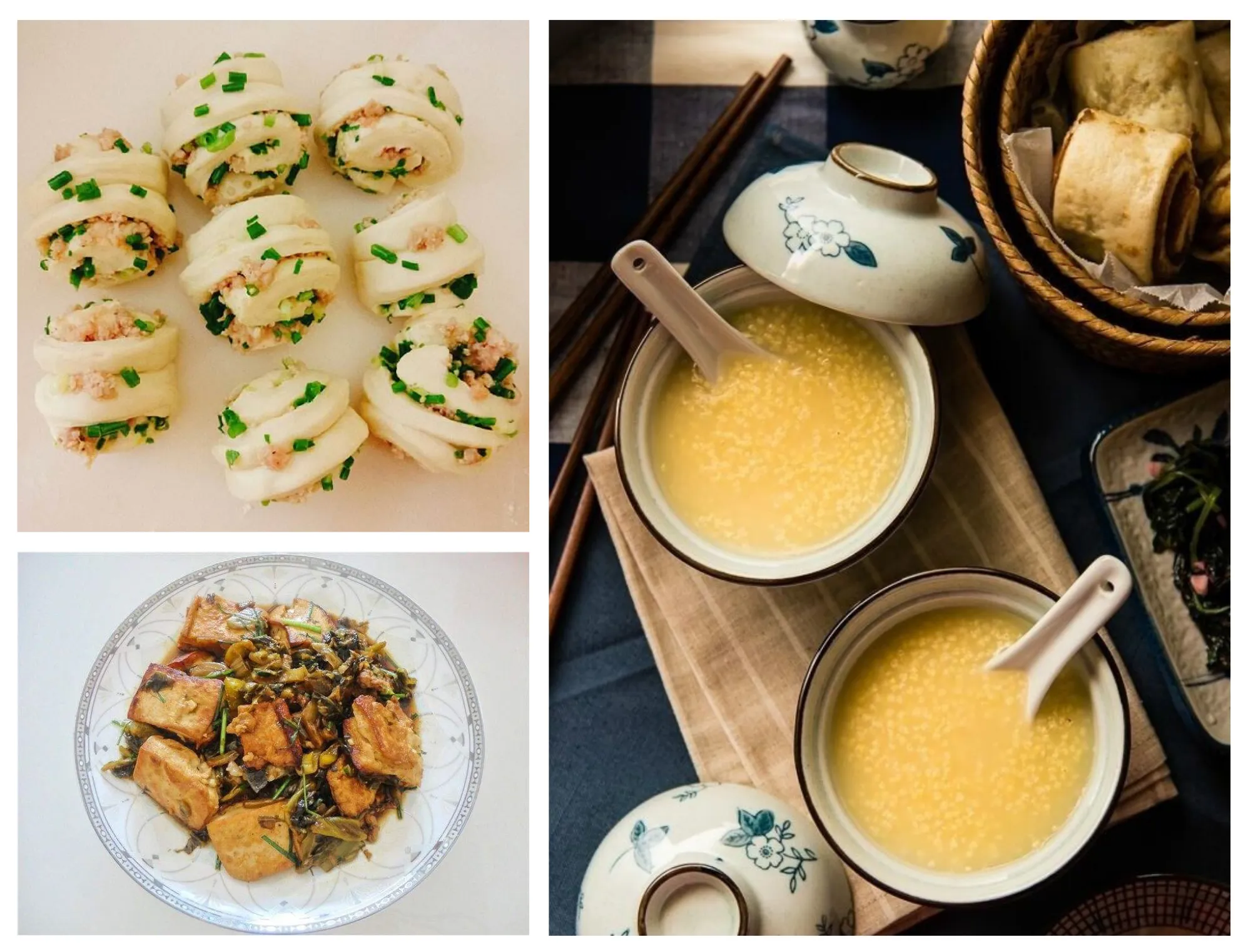 Cháo là cháo kê vàng óng, độ đặc vừa khéo; ăn kèm với cháo là đậu phụ trộn dưa muối có bỏ thêm hành hoa và dầu vừng cùng với rau cần muối chua mà người đời Đường đều thích; món chính thì là bánh mì cuộn thịt và màn thầu từ hỗn hợp ba loại bột là bột đậu, bột hạt dẻ và bột lúa mì, ngoài ra còn có trứng gà mới luộc thơm lừng.