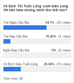 Vâng, Trai Ngầu Cầu Bại đã chiến thắng thưa quý vị!⊙▽⊙Đòn chiến thắng của anh quá ngầu với số điểm vượt trội lên 25. v. Đẹp Ngầu Cầu Bại được 6 vote.