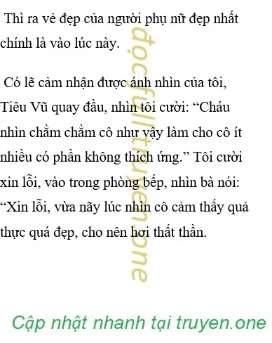Trong phòng bếp truyền ra mùi thức ăn, tôi quay đầu lại nhìn, thấy Tiêu Vũ đang cầm chảo xẻng xào thức ăn, ánh tịch dương rải rác rơi trên người của bà ấy, kèm theo đó là hơi nóng của thức ăn từ trong nồi uốn lượn bay lên, giao hòa với nhau tạo thành một bức tranh yên ả xinh đẹp, tôi không kìm được nhìn đến xuất thần.