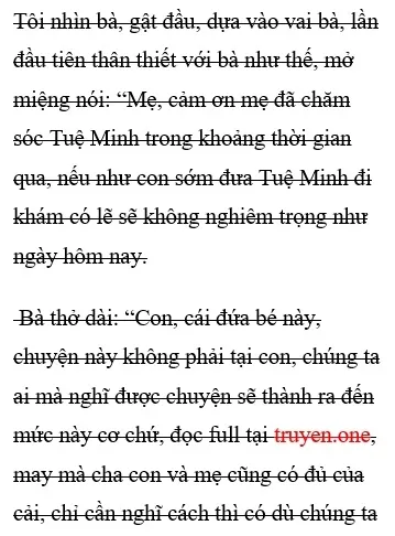 Lâm Uyên hối tôi mau về phòng bệnh nghỉ ngơi, tôi nhỏ giọng nói: “Mẹ, con không sao, quay về cũng không ngủ được, mẹ cứ để con nhìn con bé một lúc đi” Bà thấy thế cũng không tiếp tục miễn cưỡng tôi thêm nữa.