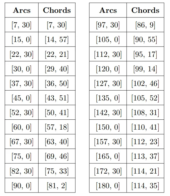 Những nhà khoa học Hy Lạp cổ đại đã sớm nhận ra rằng nếu có thể đo được độ dài các cạnh và các góc trong đa giác thì sẽ giải quyết được rất nhiều các vấn đề thiên văn học. Vì vậy, Hipparchus đã ứng dụng các phương thức tính toán thiên văn học của người Babylon (sử dụng các đơn vị độ, phút, giây) vào việc đo góc và cạnh từ đường vuông góc với xích đạo trời (celestial equator) và đúc kết thành bảng hàm dây cung. Tuy nhiên, công trình nghiên cứu này của Hipparchus không còn tồn tại nên các nhà khoa học đã xây dựng lại bảng biểu dưới đây dựa theo những kiến thức lượng giác sơ khai của ông (chord là dây cung, arc là cung).